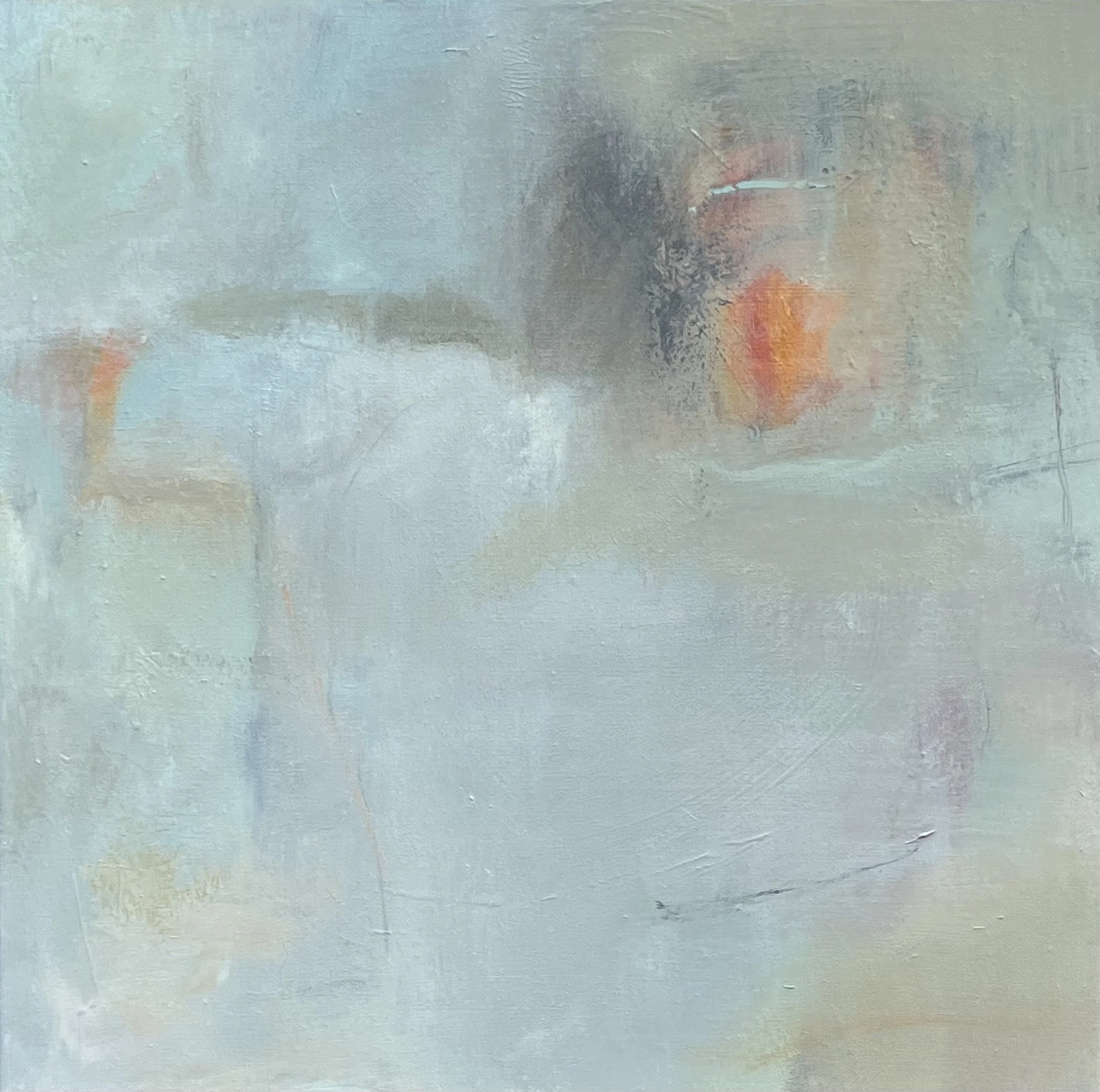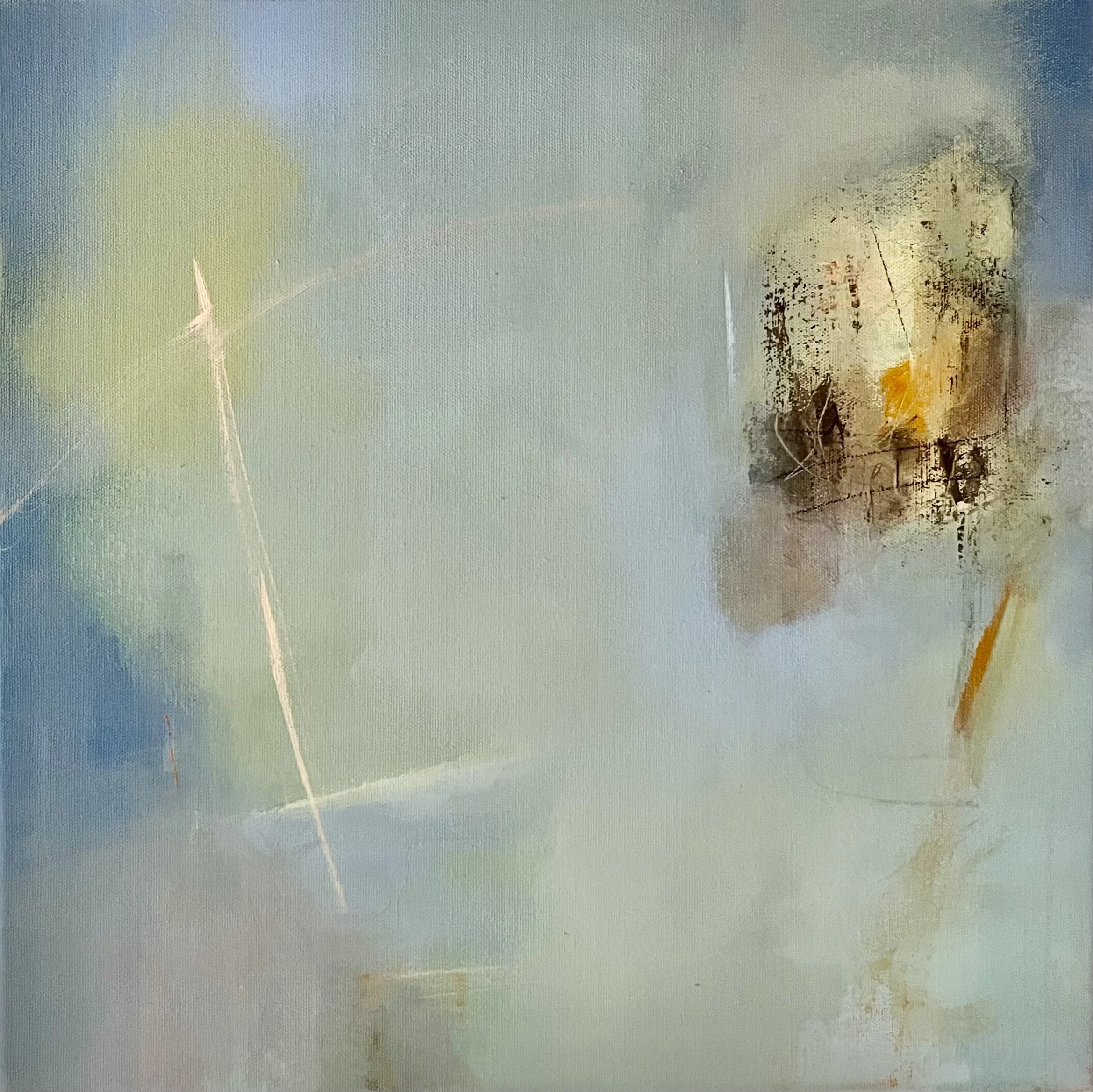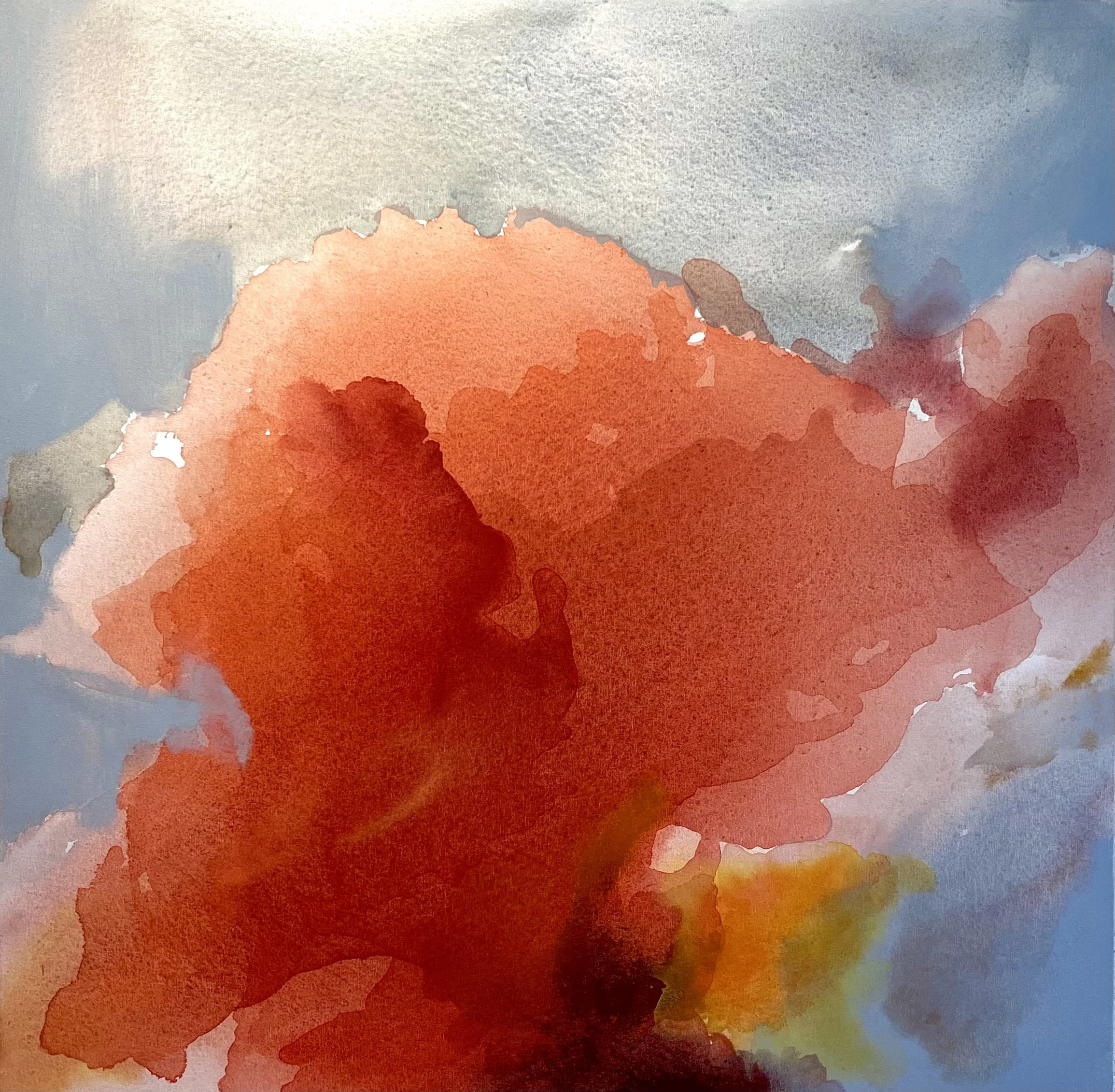 In developing this series of paintings, I was able to link both process and concept. Having prepared tinted solutions of heavily diluted paint, I begin by saturating the surface of the canvas with water, leaving certain areas dry. The fusion of pigment and water pooling on the surface helps to create the veils and skeins of delicately tinted colour, which expresses the sensations of light, vapour and mist seen in the cloud-skies above.